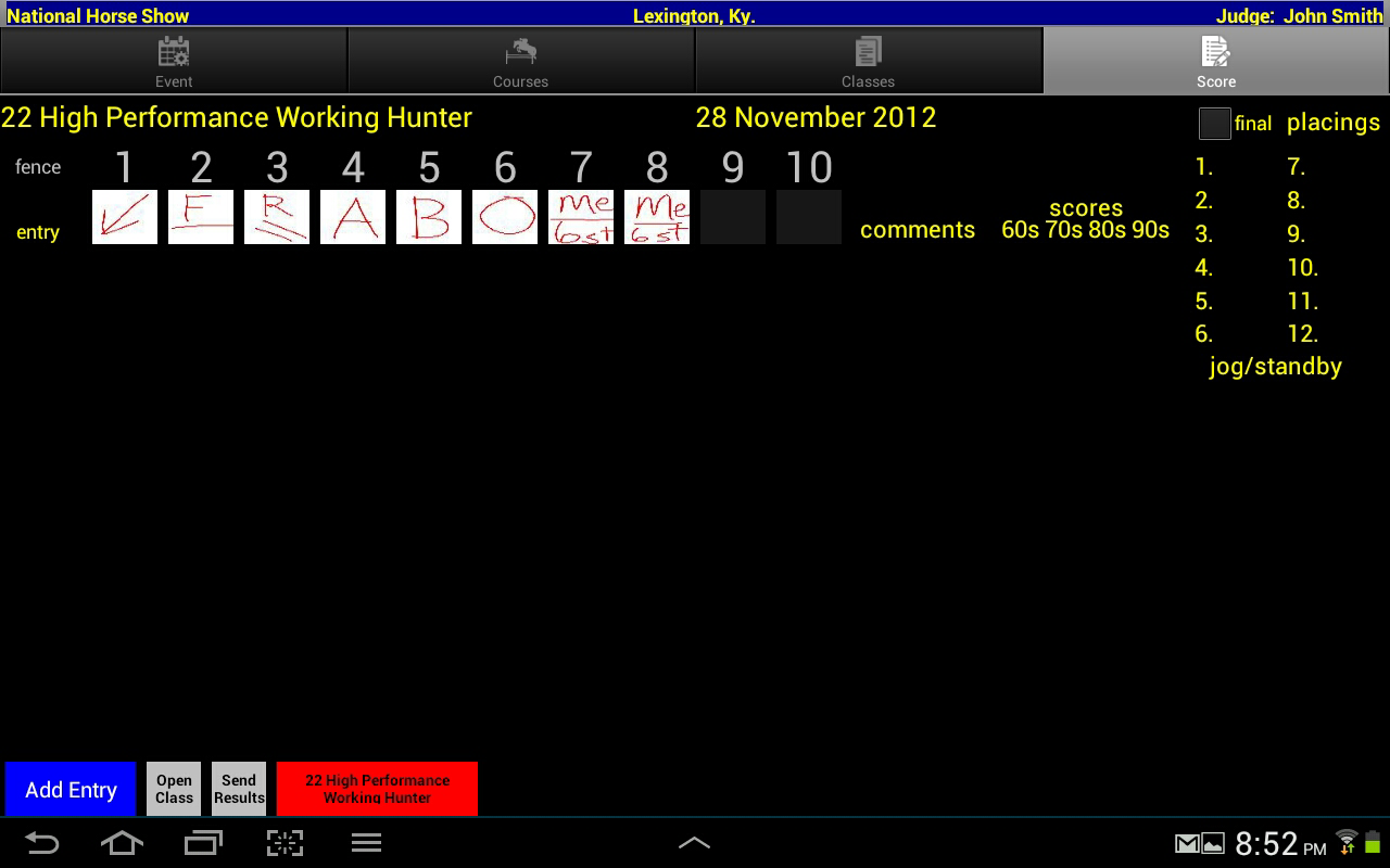 Once a score card is open, entries can be added when the rider is announced. Typically a rider is announced when entering the ring and the judge enters the riders entry number (i.e. "back number) by touching the  "Add Entry" button.
