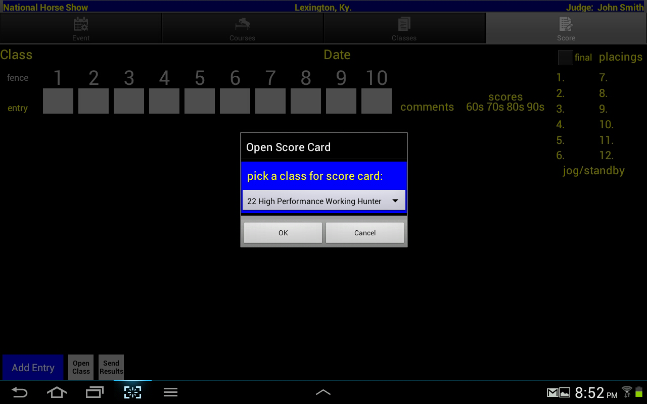 To open a score card select the Score tab. If this is the first score card to be opened you will see an "Open Score Card" dialog. Pick a class that you want to open from the drop down list and touch "OK".