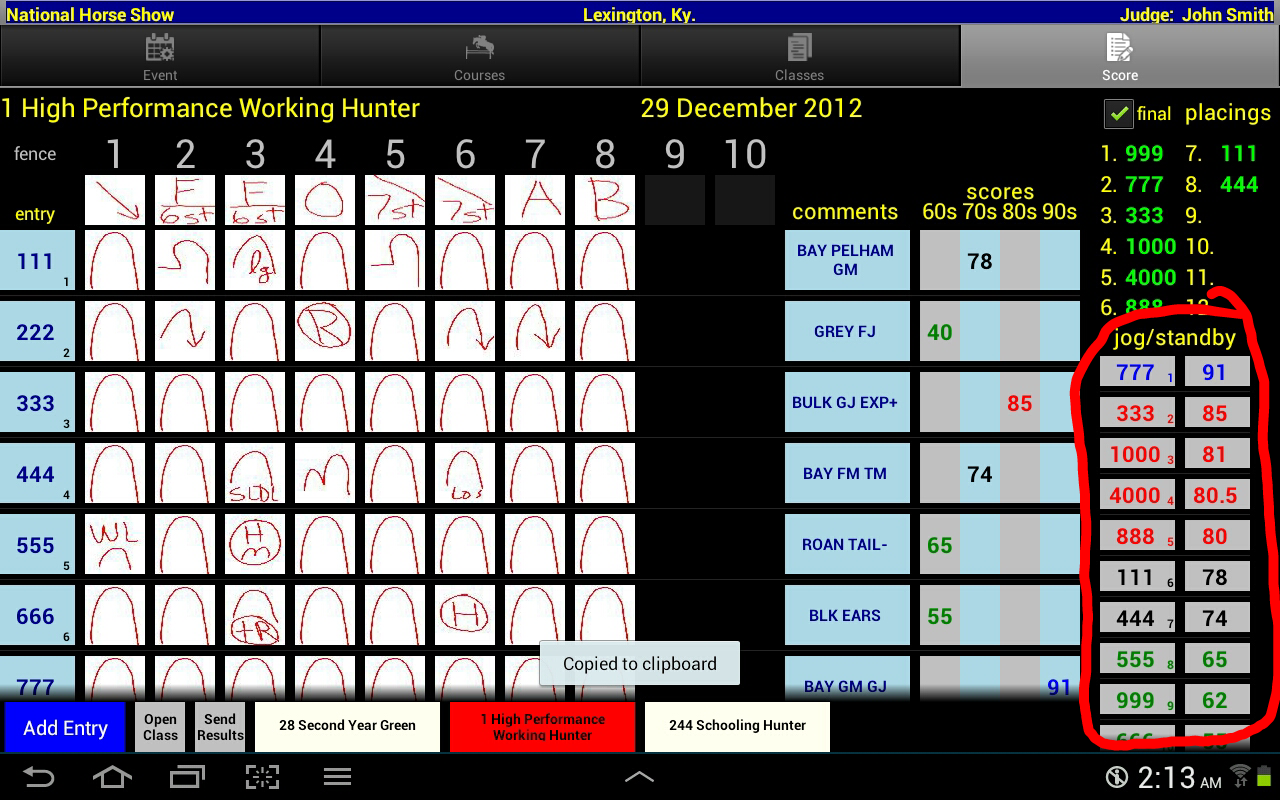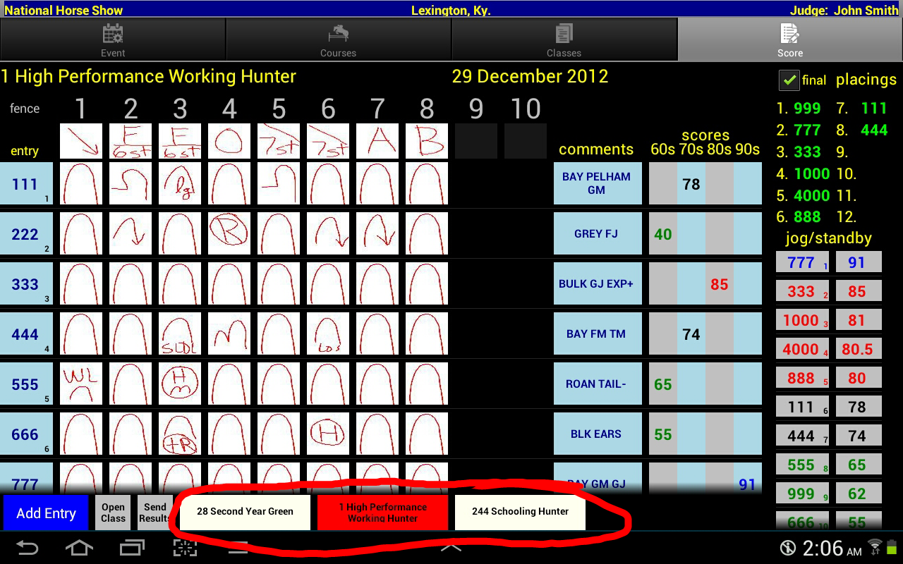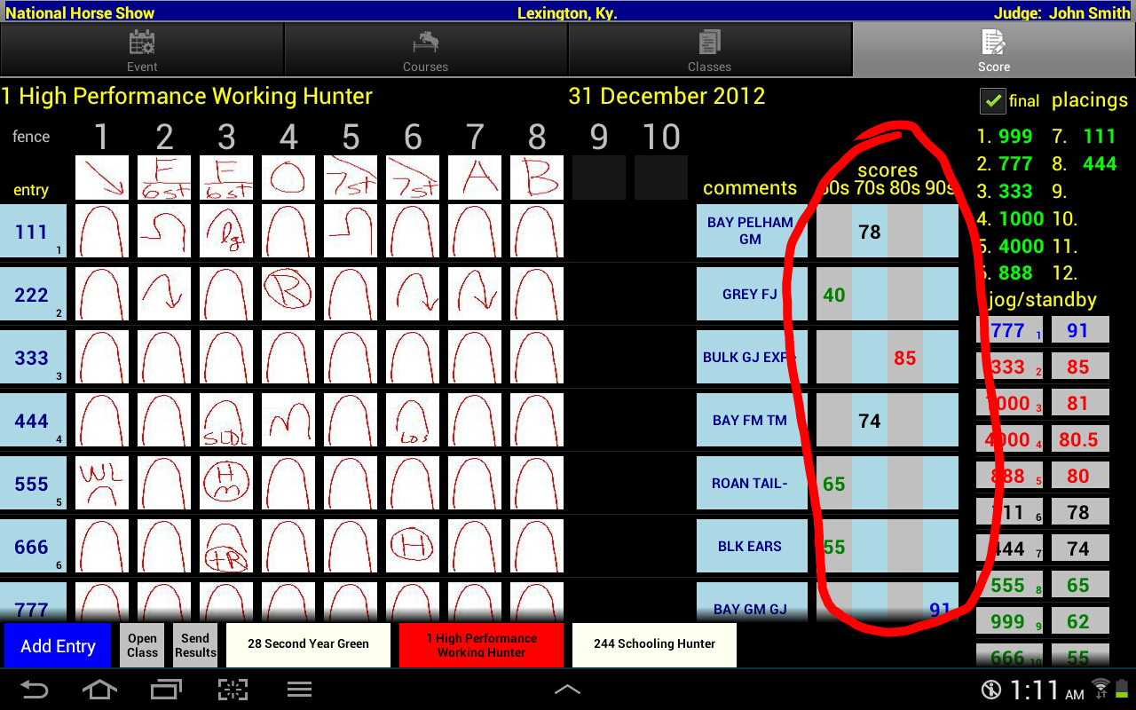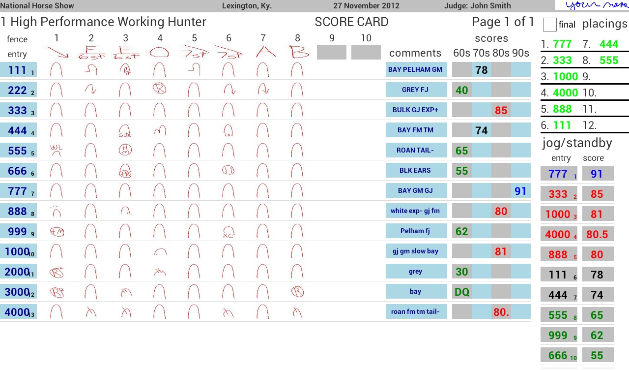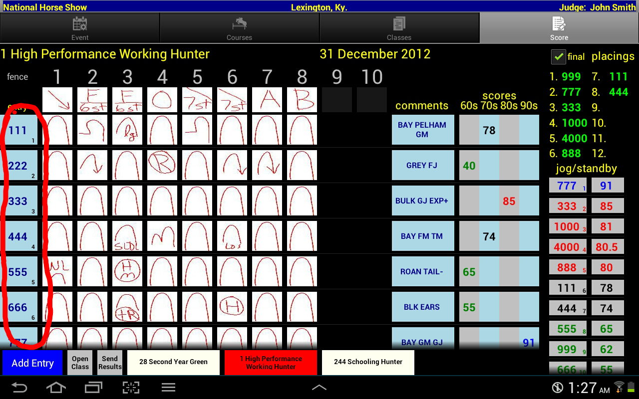 Once a class score card is selected, entries can be added to the class and scored. Scoring involves entering jump symbols, descriptive comments, and a numeric score. When a score is entered it is automatically placed in the jog/standby and placing's areas that are displayed on the right side of the screen. You can scroll through the entries and the jog/standby order to view additional entries.