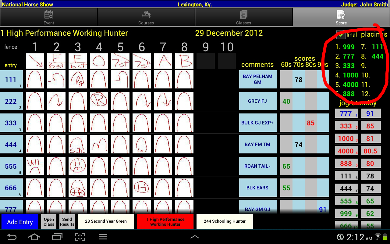 If there is a jog after the entries have been scored, the placing's order can be changed during the jog by touching and dragging entries to a new position which updates the placing's order.