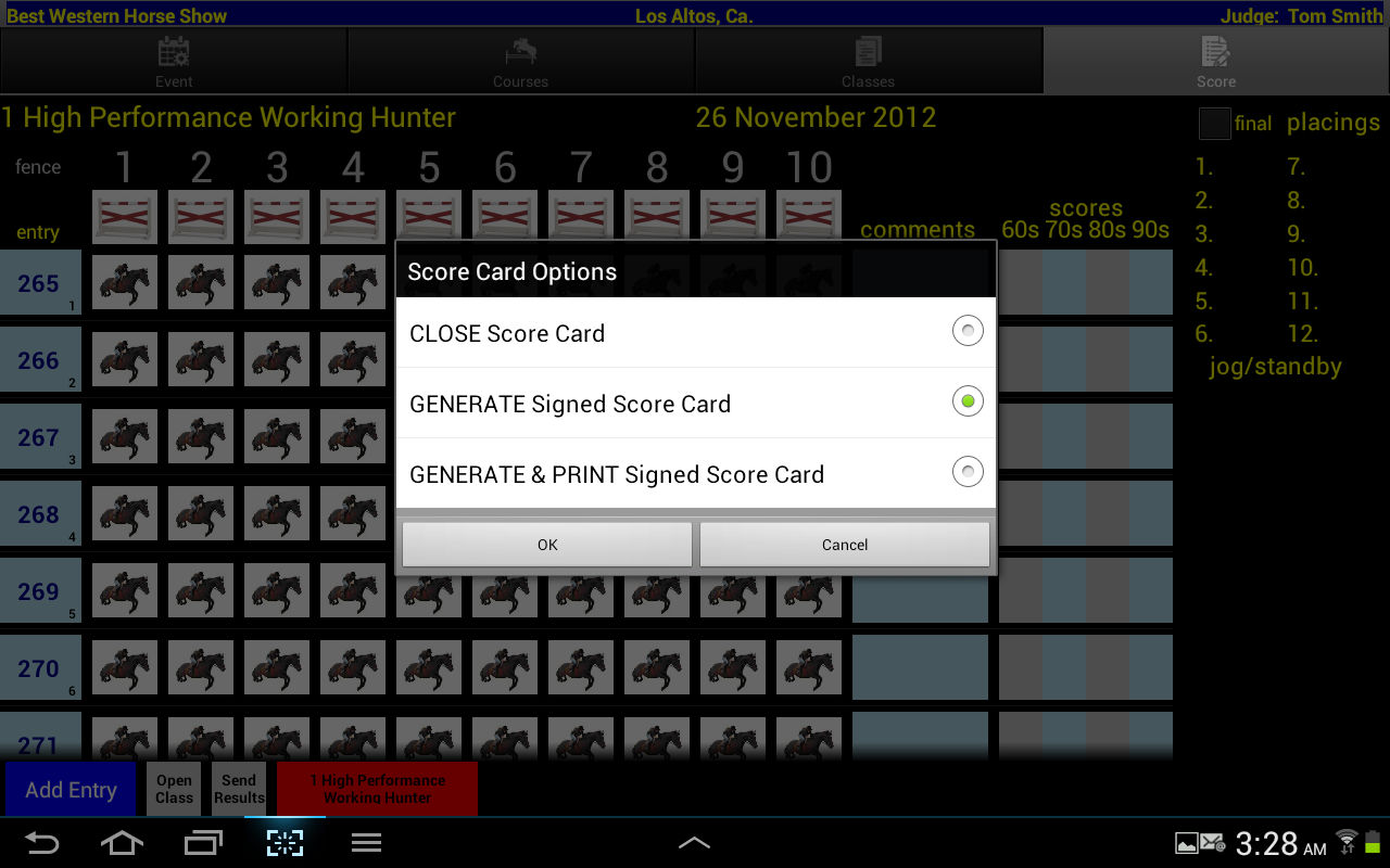 After the final placing's have been determined for a class, anapproved class score card can be generated and electronically sent to the show office and/or printed (You Score Horses - Hunter Pro version only).