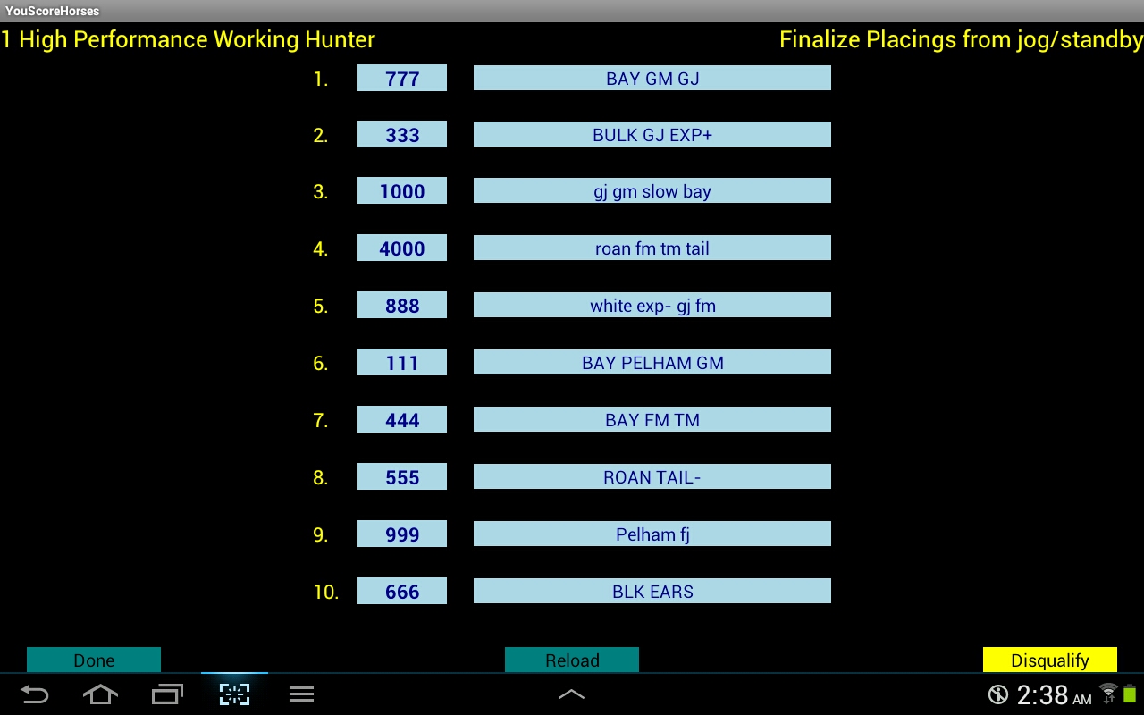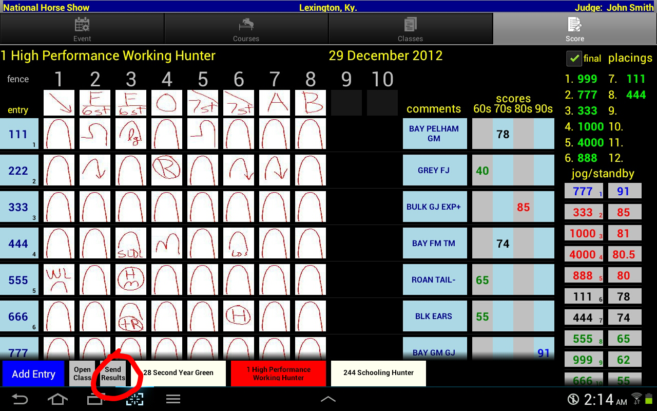 At any time you can send the current jog/standby order to the in gate person and/or announcer by touching the "Send Results" button (You Score Horses - Hunter Pro version only).